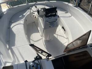 bimini. This layout keeps the cockpit clear, uncluttered, and ready for action. Going forward, there are serious nonskid