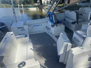 Aft starboard transom seating for two adults. Seatbox opens to reveal storage compartment w/ storage box for tool