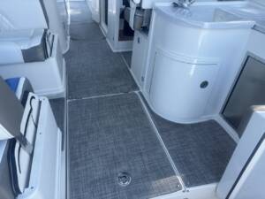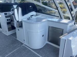 Starboard side entertainment center with refrigerator, sink, 1300W electric grill with inverter, and utility drawers.