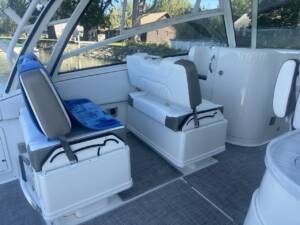 Portside cushioned seating for four on two fiberglass mounting pods, converts to single aft–facing dual lounge,