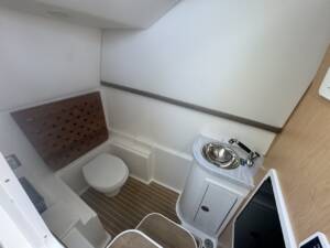 Marine head with 15-gallon holding tank with overboard discharge, teak grid seat, shower, sump, sink, and Corian