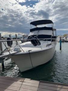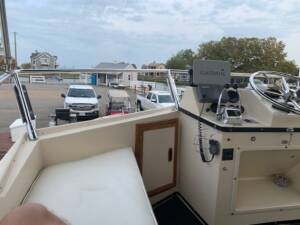 There is a roomy aft deck and large flybridge with seating for many and the warm teak wood interior and cabinetry is absolutely stunning. Nicely equipped…including 3-zone air & heat, generator, aft hard top and dual helms.